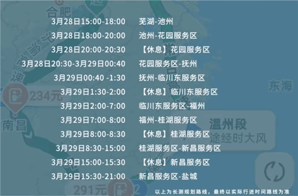 而續(xù)航挑戰(zhàn)的路程規(guī)劃,是于3月28日從蕪湖池州出發(fā),途徑撫州、臨川、福州、新昌,最后在3月29日21:00左右,到達(dá)江蘇鹽城,總路程超過(guò)2000公里。