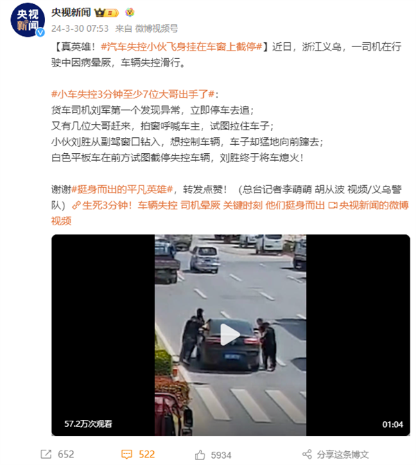 央視點贊!汽車失控小伙掛車窗上截停:救了司機一名