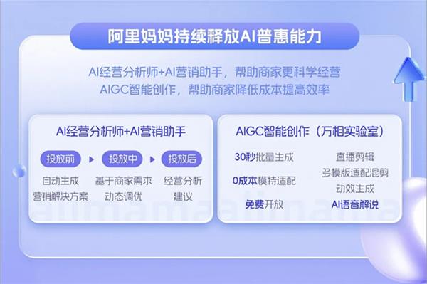 除了運營扶持,阿里媽媽還將持續(xù)向商家開放一系列新的AI工具,比如全新推出的AI經(jīng)營分析師、AI營銷助手,幫助商家做到實時市場波動監(jiān)測、經(jīng)營分析建議和自動生成營銷解決方案等。同時,包括萬相實驗室等AIGC智能創(chuàng)作工具免費向商家開放,幫助商家秒級批量智能生成圖文、智能剪輯視頻、智能搭建商品頁面等,讓商家降本增效。