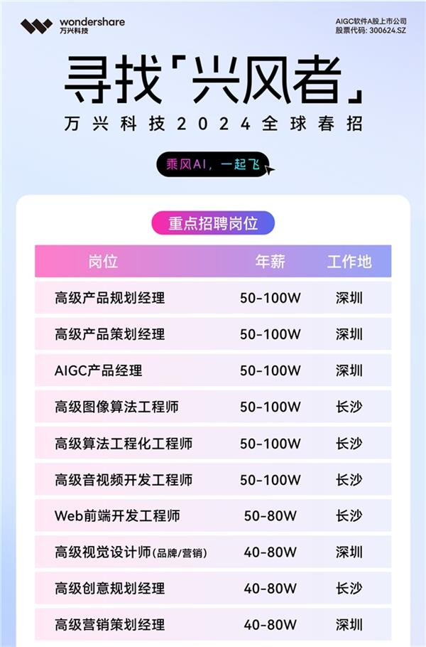 大會期間,以萬興科技為代表的AI公司共計發(fā)布1000+熱門崗位,萬興科技現(xiàn)場熱推100+AI相關(guān)崗位,其中產(chǎn)研崗位50+,包括引擎開發(fā)工程師、渲染算法、推薦算法、架構(gòu)專家、大數(shù)據(jù)開發(fā)、音視頻開發(fā)、算法工程落地等,以推進(jìn)全球頂尖人才向AI匯聚,助推產(chǎn)業(yè)高質(zhì)量發(fā)展,部分崗位年薪高達(dá)百萬。其它熱門崗位還包括視頻創(chuàng)意、繪圖創(chuàng)意、文檔創(chuàng)意、AI云化、音視頻開發(fā)、創(chuàng)意資源等方向的設(shè)計、營銷、運營。