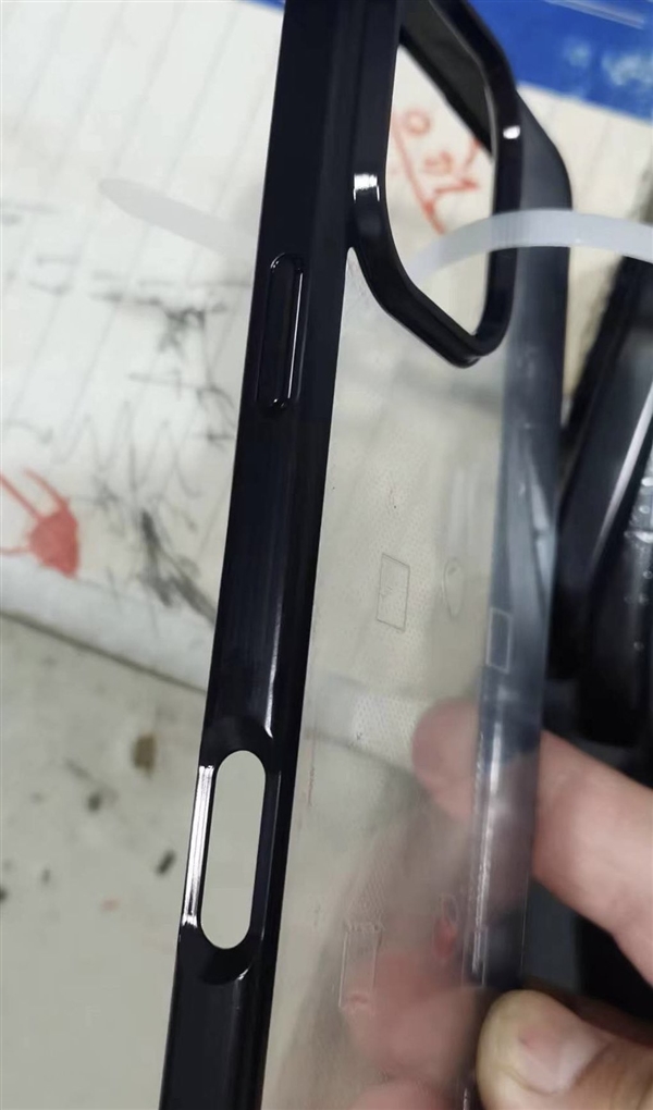 照片顯示,手機殼右側電源鍵下方有一個預留的開孔,形狀類似于Type-C,但尺寸更大。