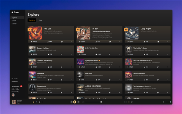 于是世超立刻打開 Suno 的網(wǎng)站試了試。結(jié)果這一試,我就打開了新世界的大門,正式走進(jìn)了華語樂壇。Suno 的頁面很簡單,主要分為三大板塊:探索、創(chuàng)作、音樂庫。