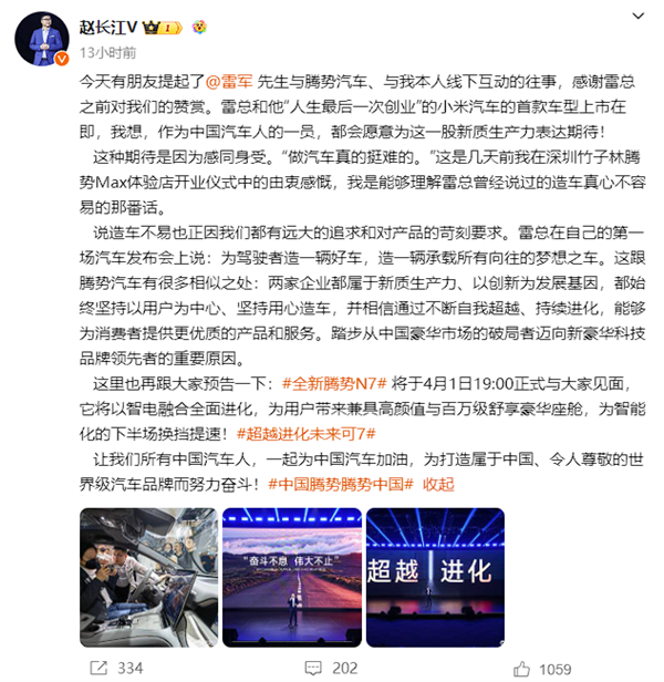趙長江稱:今天有朋友提起了雷軍先生與騰勢汽車、與我本人線下互動的往事,感謝雷總之前對我們的贊賞。