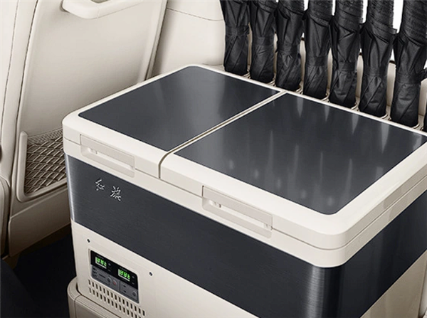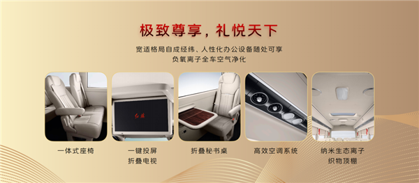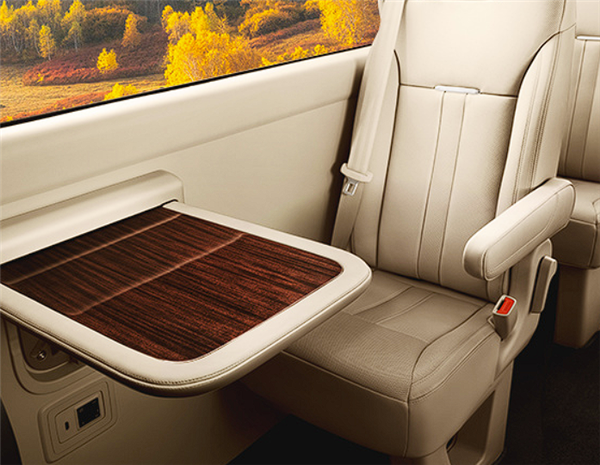 旗艦版第二排座椅還帶有辦公桌、杯架、220V電源、車載冰箱、隱藏式雨傘架、空氣凈化器等。