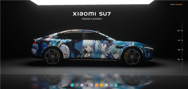 經(jīng)實測,該體驗網(wǎng)頁不僅支持多角度觀看SU7,還提供7款車漆支持自定義更換,甚至還有《原神》涂裝。