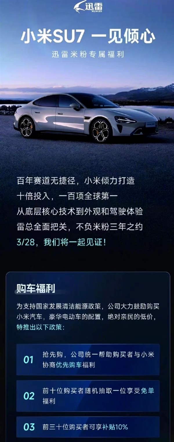 而在3月26日,該海報(bào)信息被迅雷公司撤回,但迅雷方面表示并非取消了購(gòu)車福利,而是等3月28日小米SU7上市后調(diào)整福利政策。