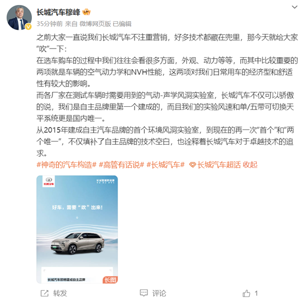 長(zhǎng)城汽車(chē)總裁:長(zhǎng)城自建風(fēng)洞風(fēng)速可達(dá)300km/h 比12級(jí)臺(tái)風(fēng)快近三倍