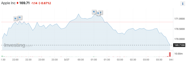 或許是受此數(shù)據(jù)影響,蘋果周二(3月26日)美股收跌0.7%,今年迄今為止,蘋果已經(jīng)下跌了約12%。
