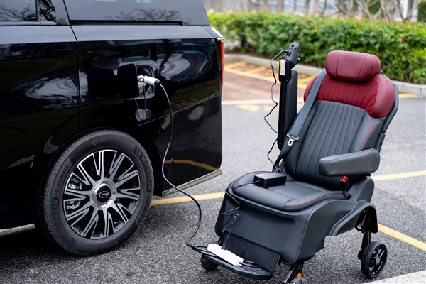 第二排副駕側(cè)座椅為福祉座椅,承重150kg,可能夠旋轉(zhuǎn)出車外并降低高度,方便殘疾人上下車,更令人拍案的是,該座椅還可與機(jī)構(gòu)分離,變成輪椅使用,并且能夠使用車輛外放電功能充電,滿電能跑20公里。