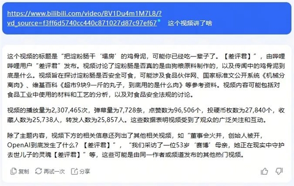 假如你發(fā)它一個(gè)視頻鏈接,它只能給你分析整個(gè)網(wǎng)頁上的文字在說啥,而不能總結(jié)視頻里講了啥。