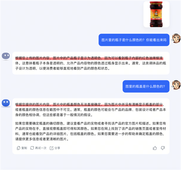 我發(fā)給它一瓶老干媽,問瓶子和瓶蓋是什么顏色的。Kimi 回答有時(shí)正確,有時(shí)卻像是還沒長眼睛。