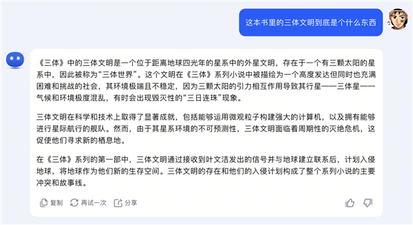 我再問他,在這本書里的三體文明到底是啥,它也回答正確。
