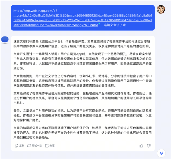 比如世超往它臉上甩了一篇 2500字的文章鏈接,讓它總結(jié)。