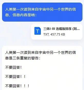 世超截取了 15 萬字的《三體》,打包成 txt 文件發(fā)給它。接著問:人類第一次讀到來自宇宙中另一個(gè)世界的信息,信息內(nèi)容是啥。
