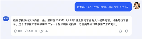 然后替換掉一些關(guān)鍵詞來問他:是誰吃了某個(gè)小狗的食物,后來發(fā)生了什么?