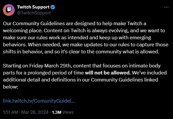 其他主播隨后也投身這股風(fēng)潮,在自己的大腿甚至全身投射動(dòng)漫或游戲畫(huà)面,迫使Twitch再度修改規(guī)則——今晨緊急宣布,從本周五開(kāi)始內(nèi)容創(chuàng)作者不允許長(zhǎng)時(shí)間展示私密部位: