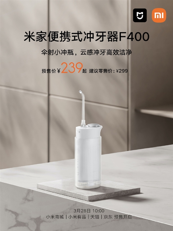 3月28日消息,小米米家便攜式沖牙器F400目前已經上市,售價239元。