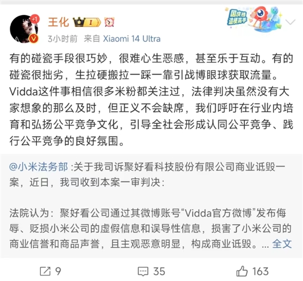 小米公關(guān)部總經(jīng)理王化也發(fā)文表示“有的碰瓷手段很巧妙,很難心生惡感,甚至樂于互動(dòng)。有的碰瓷很拙劣,生拉硬搬拉一踩一靠引戰(zhàn)博眼球獲取流量?!?/strong>