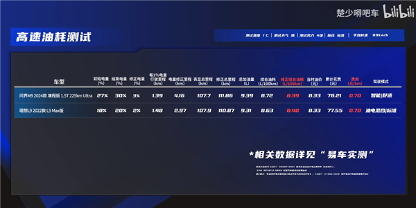需要說明的是,由于節(jié)目制作時理想L9新款并未上市,所以此次對比采用的還是2022款L9,而問界M9自重更大(比L9重了110公斤)、后車輪胎更寬,在能耗方面處于下風,可以說雙方對比后各有