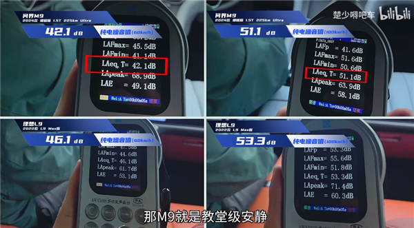 綜合來看,問界M9分貝更低(更安靜),燃油怠速、燃油行駛、純電行駛、急加速狀態(tài)下,均是問界M9表現(xiàn)更好,只有純電怠速狀態(tài)下,理想L9表現(xiàn)稍好。