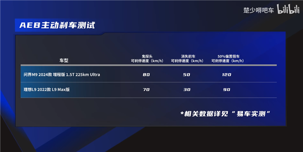 問界M9各項均優(yōu),鬼探頭80km/h可剎停、消失的前車50km/h可剎停、50%偏置假車120km/h可剎停,2022款理想L9則是70km/h、30km/h和90km/h。