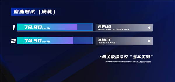 滿載:理想L9:74.3公里/小時;問界M9:78.9公里/小時。