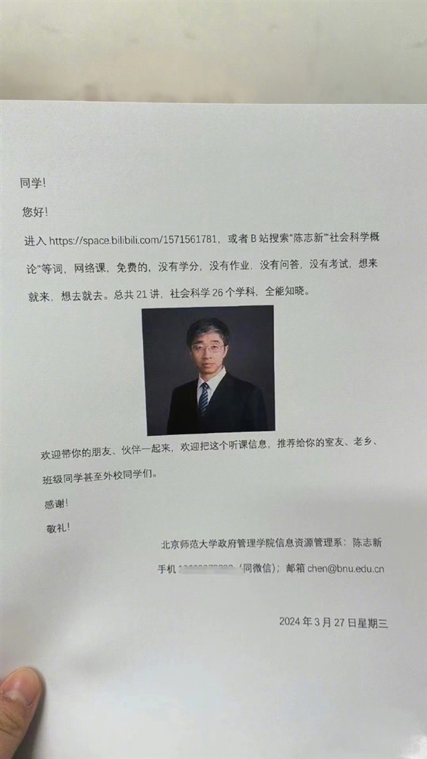 3月28日消息,據(jù)媒體報(bào)道,近日,網(wǎng)傳北京師范大學(xué)副教授陳志新發(fā)傳單推薦自己一門叫做“社會(huì)科學(xué)概論”的課程。
