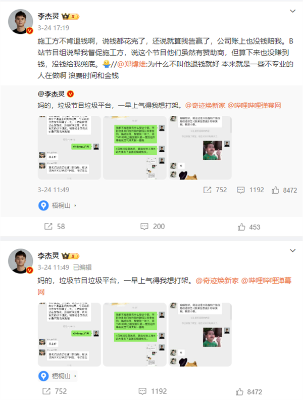 近日其再次發(fā)微博吐稱參加綜藝節(jié)目“奇跡煥新家”,表示花了120萬(wàn)裝修,一年過(guò)去了,裝修進(jìn)度和效果都未達(dá)標(biāo)。博主表示,如果4月還沒(méi)弄好,將去B站樓下直播維權(quán)。