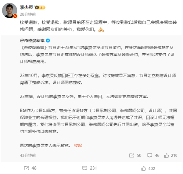 我們已于近期和李杰靈本人溝通并達(dá)成了共識(shí),因設(shè)計(jì)師無(wú)法短期內(nèi)履約,我們將協(xié)同節(jié)目承制公司、裝修顧問(wèn)公司先行共同出資,給予李杰靈全部簽約金額補(bǔ)償以表歉意。再次向李杰靈本人表示歉意。