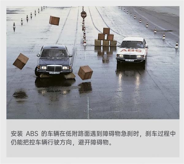 安裝 ABS 的車輛在低附路面遇到障礙物急剎時,剎車過程中仍能把控車輛行駛方向,避開障礙物。