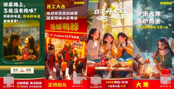 物料海報(bào)的設(shè)計(jì)也充分體現(xiàn)了 AI 的智能應(yīng)用。絕味利用 AI 設(shè)計(jì)工具,快速生成多樣化的海報(bào)創(chuàng)意,提高了設(shè)計(jì)效率和質(zhì)量。尤其在包裝設(shè)計(jì)上,更是融入了新春“龍”的元素,中國(guó)紅的新春設(shè)計(jì)和發(fā)財(cái)桶完美結(jié)合。在春節(jié)期間宣傳海報(bào),利用AI高效結(jié)合不同的消費(fèi)場(chǎng)景和不同年齡的目標(biāo)受眾,生成一批優(yōu)質(zhì)海報(bào)的風(fēng)格和內(nèi)容,確保海報(bào)與營(yíng)銷策略的高度一致性。