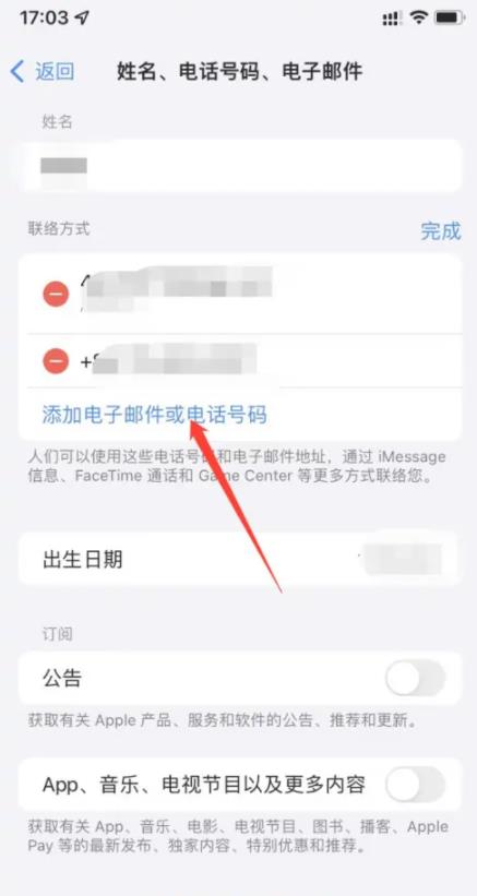 在編輯頁面,點擊添加新的電話號碼/電子郵件;