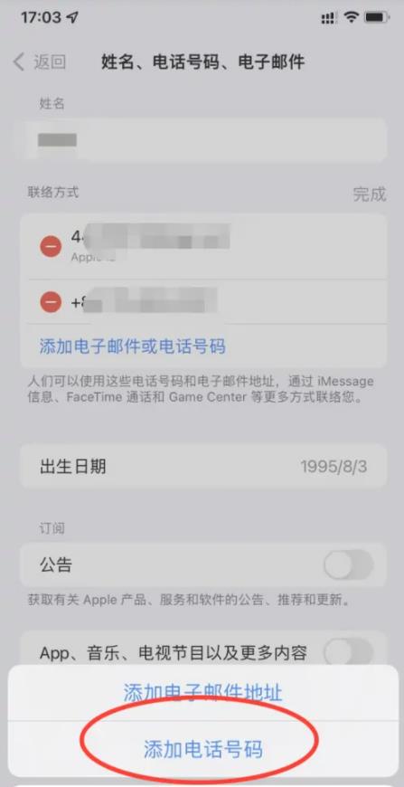 在選項中選擇添加電話號碼,綁定新的手機(jī)號并保存;
