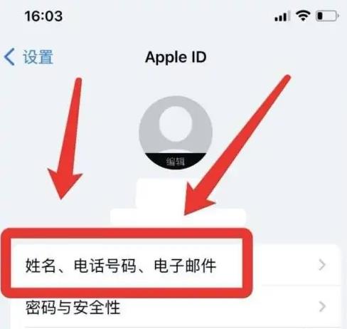 首先打開手機(jī)設(shè)置,進(jìn)入Apple ID頁,打開“姓名、電話號(hào)碼、電子郵件”頁面。