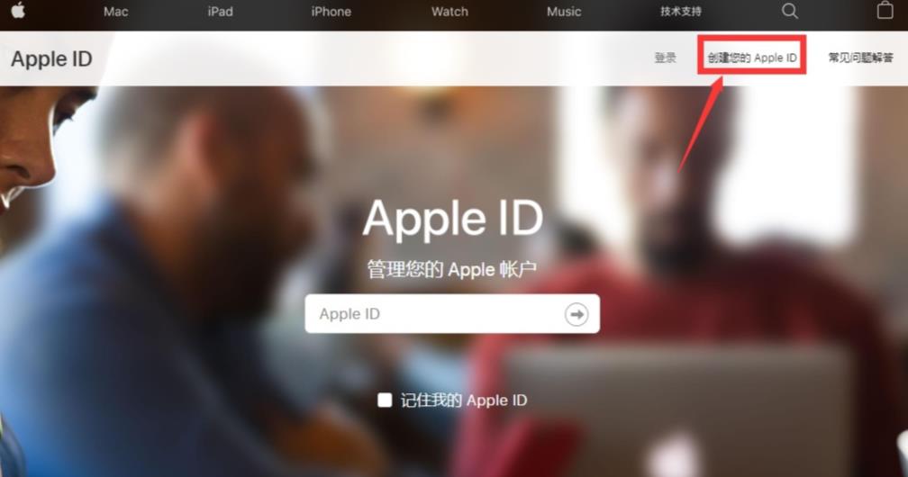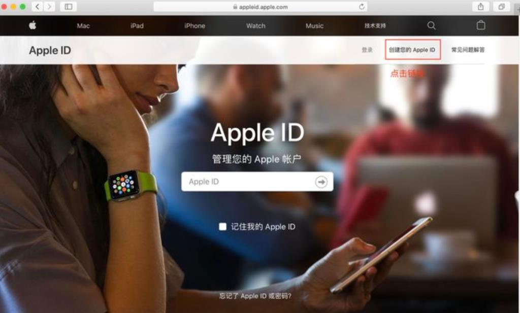 1、在瀏覽器里面打開蘋果ID官網(wǎng)(appleid.apple.com),點(diǎn)擊右上角的創(chuàng)建按鈕。
