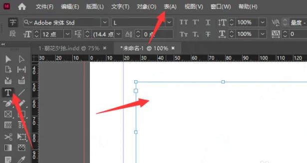 1、在打開的ID畫板中,先選擇創(chuàng)建一個文本框,打開表菜單