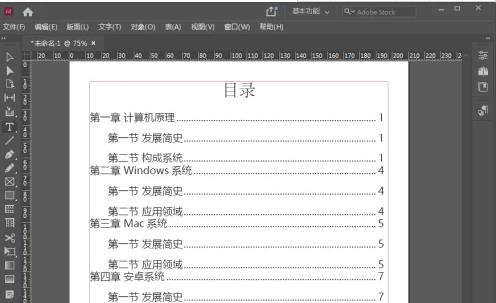 3、單擊【確定】按鈕后,鼠標(biāo)光標(biāo)變成置入文本標(biāo)志,在目錄內(nèi)容放置頁(yè)面上按Shift鍵自動(dòng)排文即可生成目錄內(nèi)容,但是,目錄內(nèi)容尚未格式化,如圖所示。