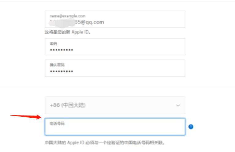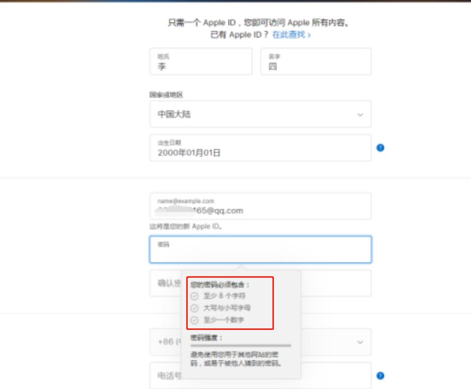 4、填寫出生日期,創(chuàng)建Apple賬號(hào)&密碼,ID是您的郵箱(常用郵箱有qq郵箱/163郵箱等等) ;下一步設(shè)置密碼(注意密碼設(shè)置需至少8個(gè)字符、少-個(gè)數(shù)字、包含大小寫字母)