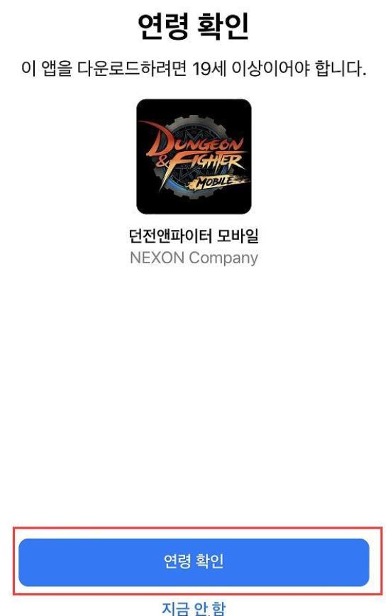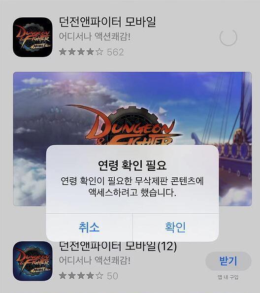 2、登錄韓國(guó)賬戶成功之后,我們搜索一個(gè)需要17+認(rèn)證的APP進(jìn)行下載,比如說”DNF” ,在搜索出來的列表點(diǎn)下載安裝按鈕;然后就彈出一個(gè)進(jìn)行實(shí)名認(rèn)證的選擇按鈕,我們右邊的”確認(rèn)”按鈕,如下圖所示