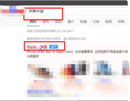 1、打開百度搜索欄,輸入【蘋果中國】,打開蘋果官網(wǎng)界面
