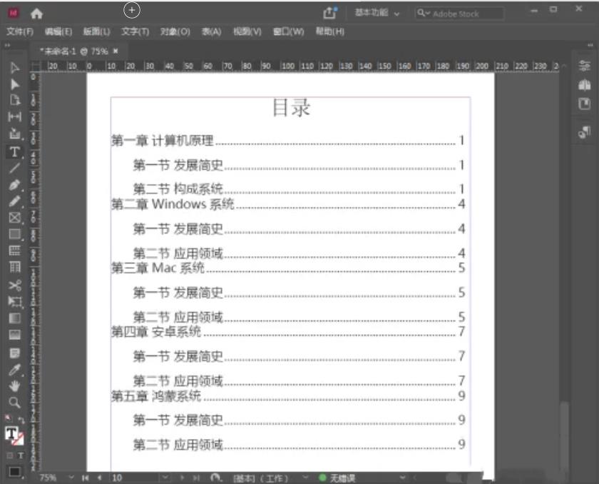 3、單擊【確定】按鈕后,鼠標光標變成置入文本標志,在目錄內(nèi)容放置頁面上按Shift鍵自動排文即可生成目錄內(nèi)容,但是,目錄內(nèi)容尚未格式化,如圖所示。