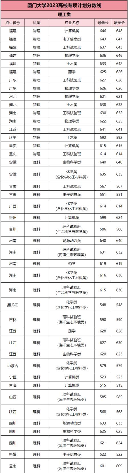 廈門大學(xué)是一所985、211院校,在2023年高校專項計劃中針對安徽、福建、甘肅、寧夏、河南等多個省份進行了招生,招生專業(yè)和人數(shù)較多,例如:電子信息類、藥學(xué)、工科試驗班、法學(xué)類、能源動力類、人文科學(xué)實驗班類等專業(yè)。以下是廈門大學(xué)2023高校專項計劃在不同專業(yè)中的錄取分數(shù)線,供查閱。