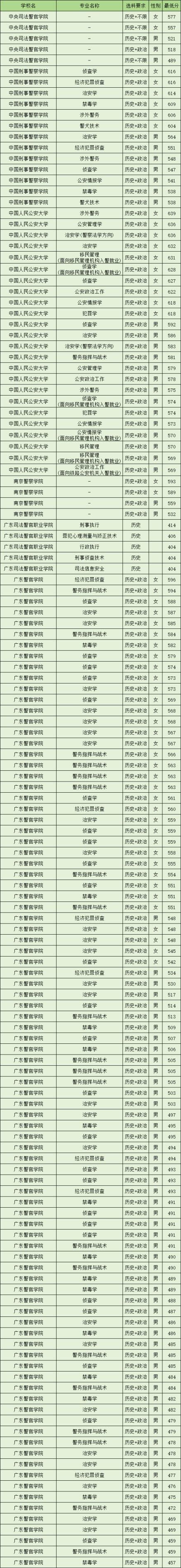各警校在廣東歷史類錄取分?jǐn)?shù)線一覽表如下: