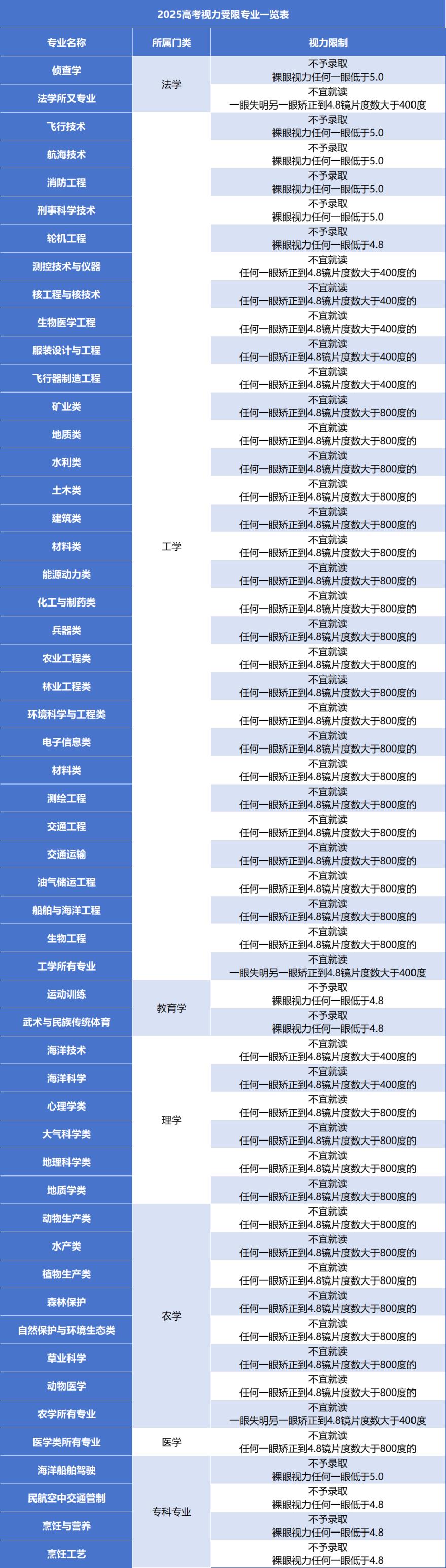 視力受限的考生在選擇專業(yè)時同樣需要注意,特別是裸眼視力或矯正視力未達到特定要求的考生。以下是2025年高考視力受限專業(yè)一覽表: