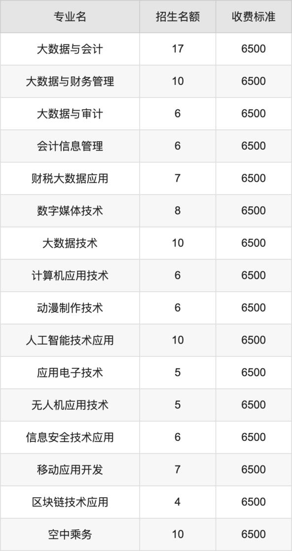 陜西財經(jīng)職業(yè)技術(shù)學(xué)院理科高職??婆灿?9個招生專業(yè),各專業(yè)每年的學(xué)費是6500元。