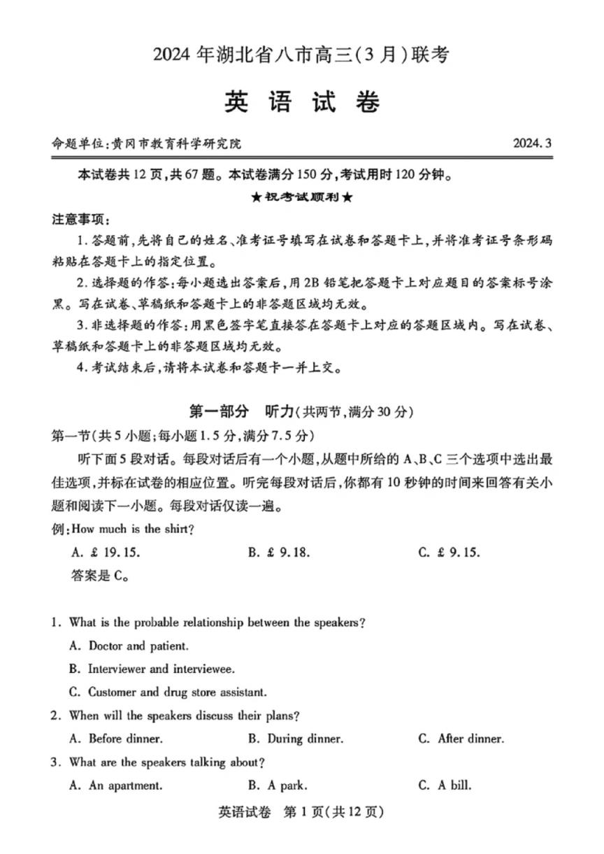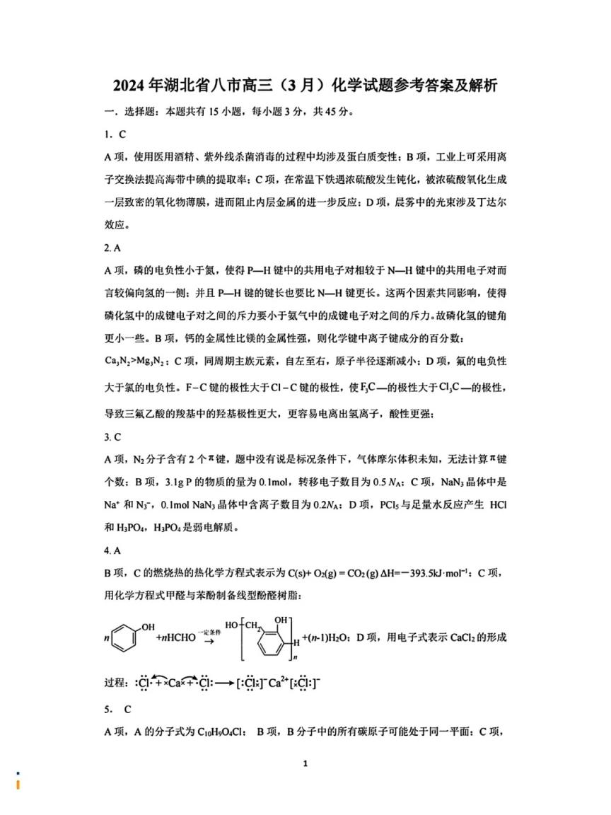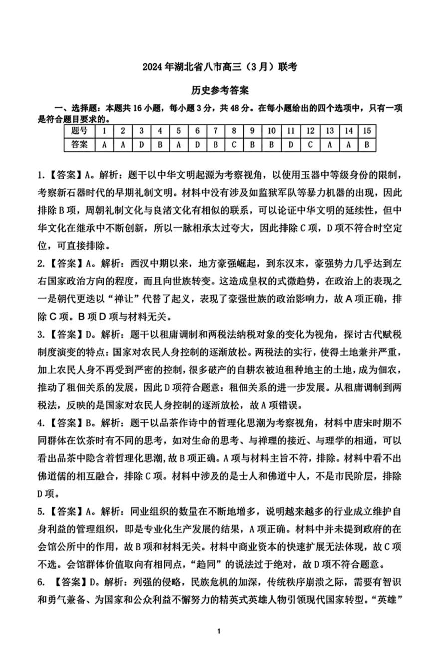 二、2024湖北省八市聯(lián)考試卷及答案匯總