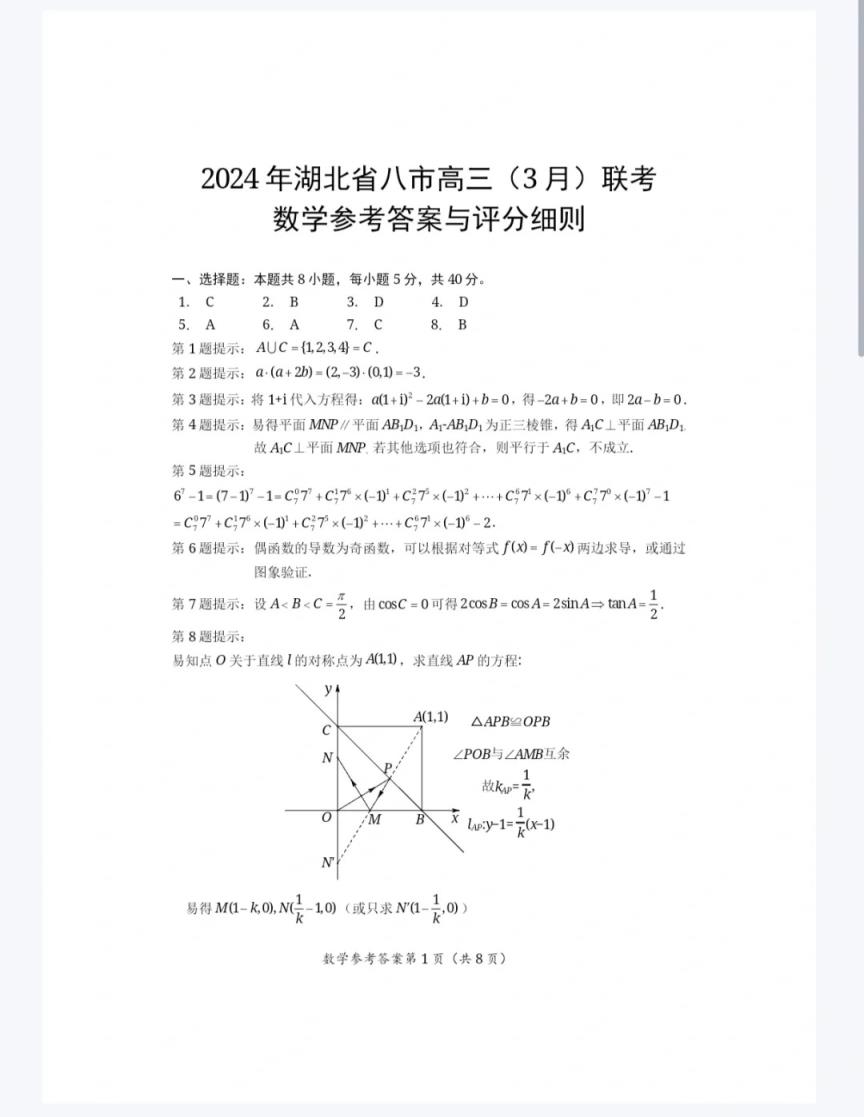 2、湖北八市聯(lián)考2024數(shù)學(xué)