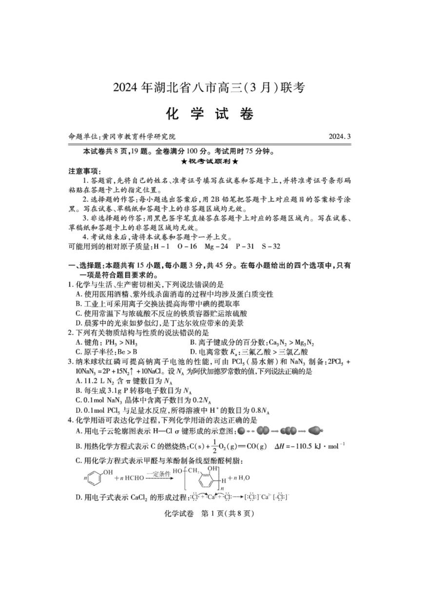 2024年湖北省八市聯(lián)考各科試卷及參考答案(高三九科全)