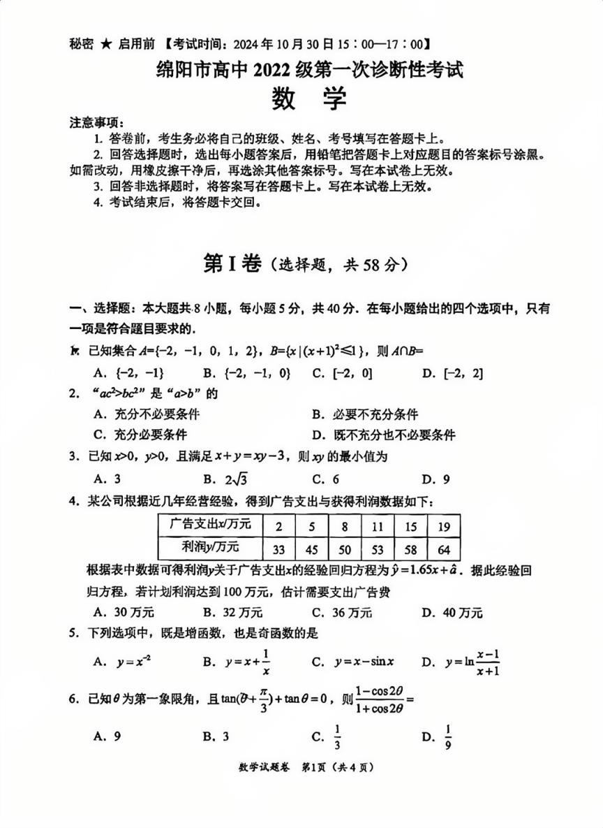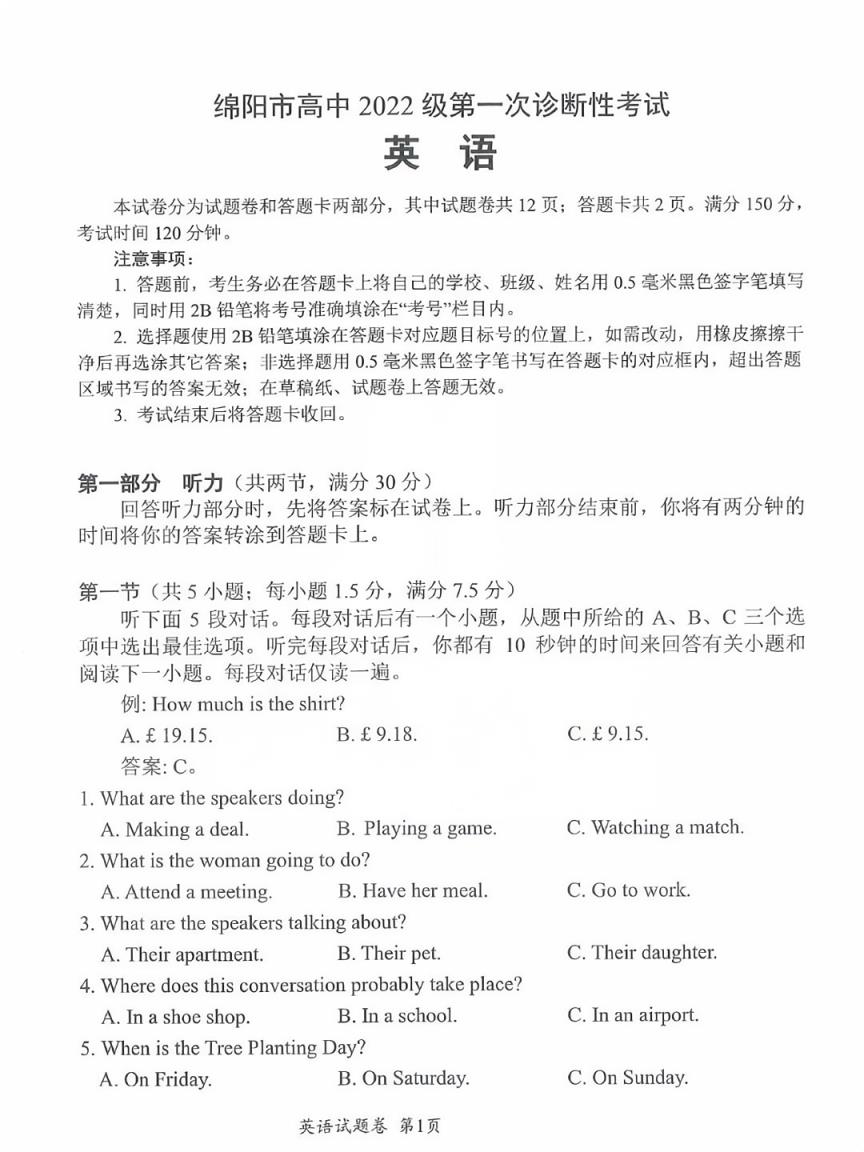 2025綿陽市一診考試答案+試卷真題(含語數(shù)英政史地物化生)