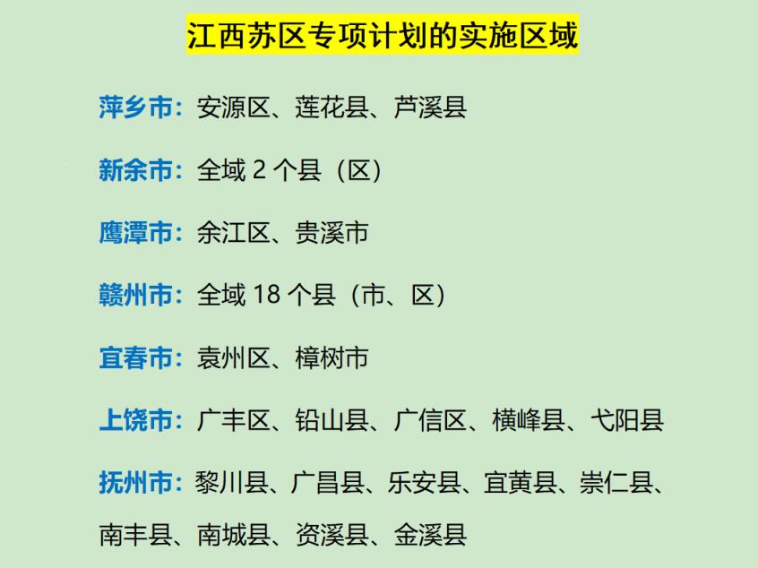 該項政策的實施區(qū)域覆蓋了原54個中央蘇區(qū)振興發(fā)展規(guī)劃縣,包括萍鄉(xiāng)市、新余市、鷹潭市、贛州市、宜春市、上饒市、吉安市、撫州市等地的多個縣(市、區(qū))。